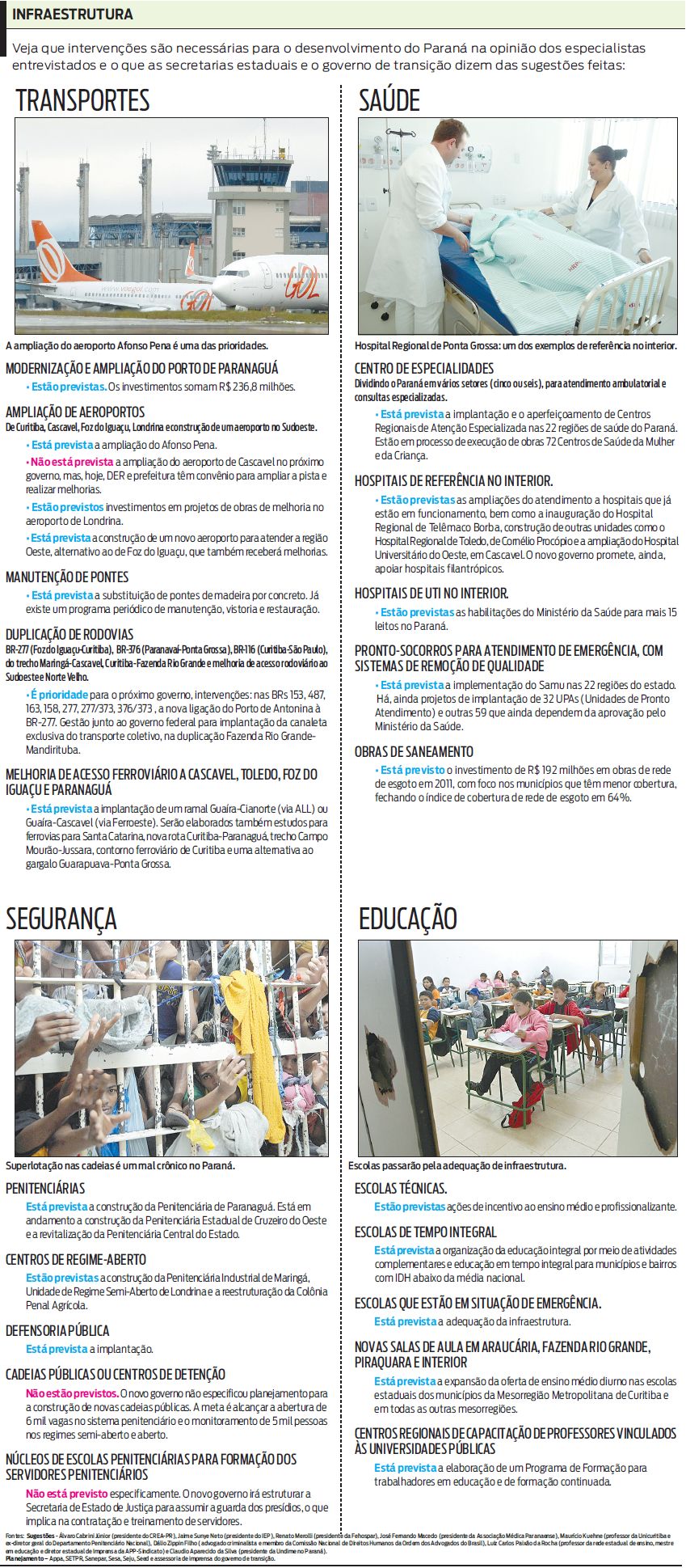 Quando se fala em desenvolvimento, a primeira condição que costuma vir à cabeça é a execução de obras públicas. Com a intenção de tentar desvendar quais são as necessidades do Paraná, a Gazeta do Povo foi a campo e conversou com especialistas das áreas de saúde, educação, transportes e segurança, e listou quais são as ações prioritárias para o desenvolvimento do estado. O levantamento consolidado está no quadro ao lado, junto com as respostas das secretarias de estado e do governo de transição. A intenção é mostrar o que o estado precisa e o que será realmente feito pelo governo.