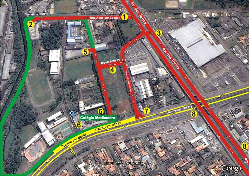 No site do colégio (www.colegiomedianeira.com.br) existe um comunicado aos pais dos alunos sobre a mudança. Também são sugeridos caminhos alternativos para chegar ao colégio: pela Avenida das Torres, sentido bairro, entrando na Rua Aquilino Baglioli (fundos da PUC); Avenida das Torres, sentido Centro, entrando na João Marchesini; Avenida das Torres fazendo retorno em frente ao Cietep (Centro Integrado dos Empresários e Trabalhadores do Estado do Paraná) e entrando no acesso ao bairro Prado Velho ou pela própria Linha Verde neste caso, quem está no sentido Atuba/Pinheirinho, entra antes do acesso anterior, na Rua João Marchesini; e quem está no sentido Pinheirinho/Atuba entra na Avenida das Torres fazendo retorno mais adiante para entrar na Rua João Marchesini.