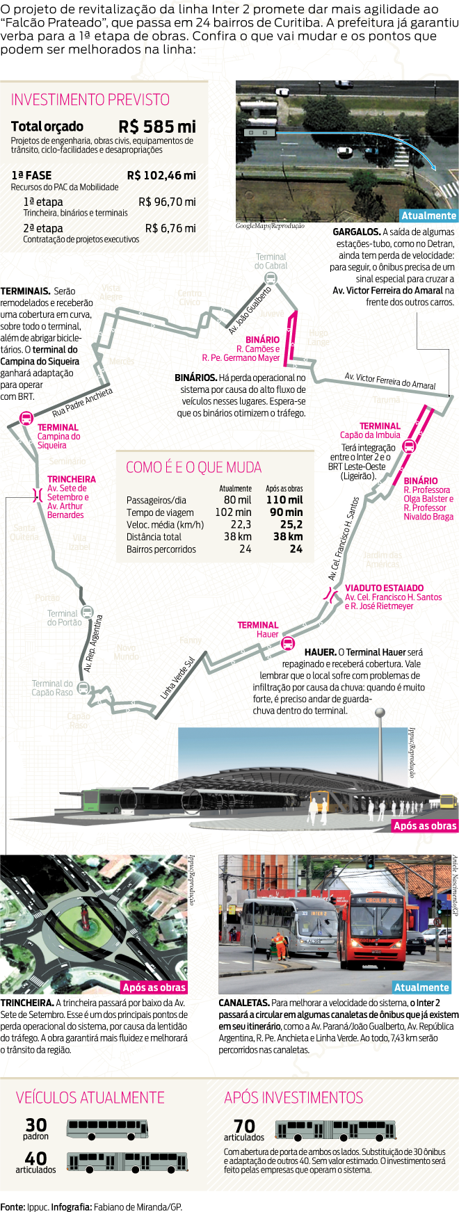 Daqui por diante, os binários estruturas viárias que ganharam espaço nos últimos anos só terão vez se ajudarem a desafogar o trânsito que está no itinerário de grandes linhas do transporte coletivo, como é o caso do Inter 2. Todos os dias, cerca de 88 mil passageiros embarcam em um veículo da linha. Além de ter uma das maiores demandas da Rede Integrada de Transporte (RIT), que serve a Curitiba e cidades da região metropolitana, o "Falcão Prateado" também faz um dos maiores itinerários do sistema: 38 quilômetros, por 24 bairros da capital. Para dar a volta completa, o passageiro leva hoje, no mínimo, 102 minutos. Esse Inter 2 atual está com os dias contados: um projeto de remodelação da linha foi incluído no PAC e a prefeitura já garantiu R$ 102,46 milhões, de um total de R$ 585 milhões, para a primeira fase de obras.