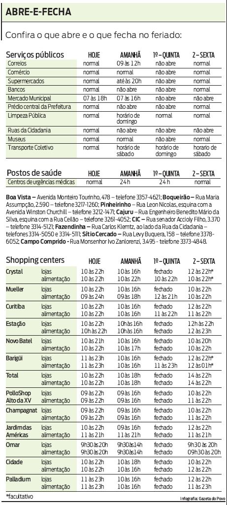 As linhas urbanas e metropolitanas do sistema de transporte coletivo de Curitiba terão o horário alterado a partir desta quarta-feira (31). Os postos de saúde da capital também vão ter o atendimento reduzido.