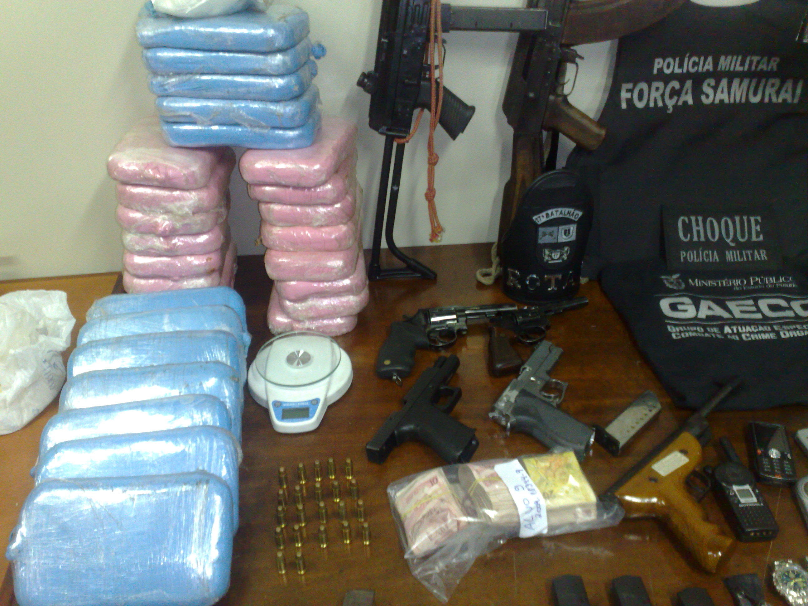 Até as 15h foram apreendidos aproximadamente 28 quilos de drogas, entre crack e cocaína, nove buchas de cocaína, quatro coletes a prova de balas, R$ 110 mil em dinheiro, dez carros, uma moto, notas fiscais em nome de Stocco, além de sete armas (uma pistola .40, uma espingarda calibre 22 semi-automática com queixa de roubo , dois fuzis um Coult e um AK , uma submetralhadora Taurus Famae e dois revólveres 38).