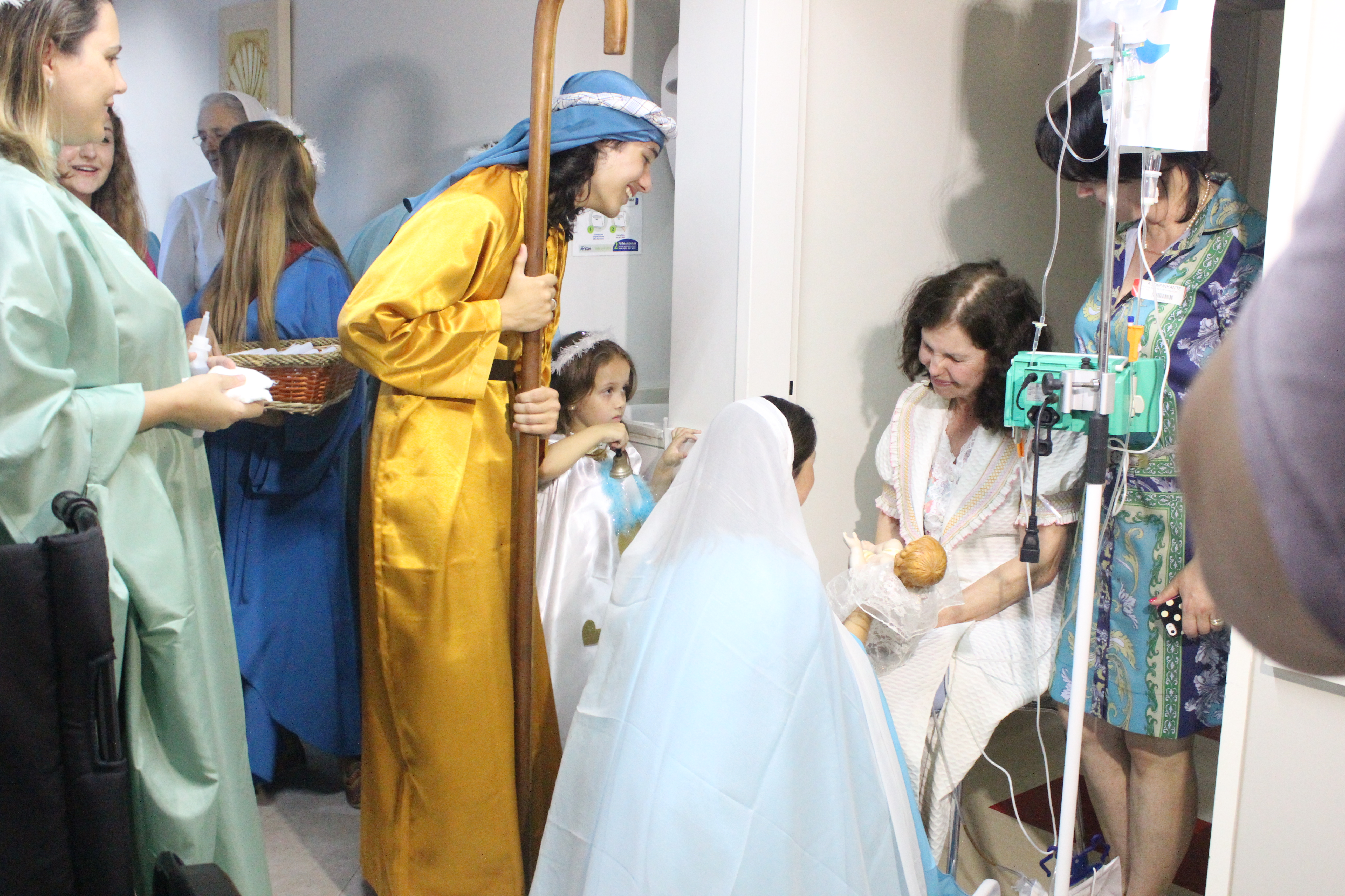 Voluntários representando José, Maria e os Reis Magos e uma criança vestida de anjo levaram palavras de fé, força e alegria aos pacientes, além de uma imagem do Menino Jesus a todos os leitos.