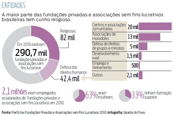 O Brasil criou 118,7 mil fundações privadas e associações sem fins lucrativos entre 2001 e 2010, 49% delas nos últimos cinco anos. Em 2010, existiam, no total, 290,7 mil fundações privadas e associações sem fins lucrativos no país, a maioria de cunho religioso. As informações são da Agência Brasil e fazem parte do Perfil das Fundações Privadas e Associações sem Fins Lucrativos em 2010, divulgado ontem pelo Instituto Brasileiro de Geografia e Estatística (IBGE) e pelo Instituto de Pesquisa Econômica Aplicada (Ipea).