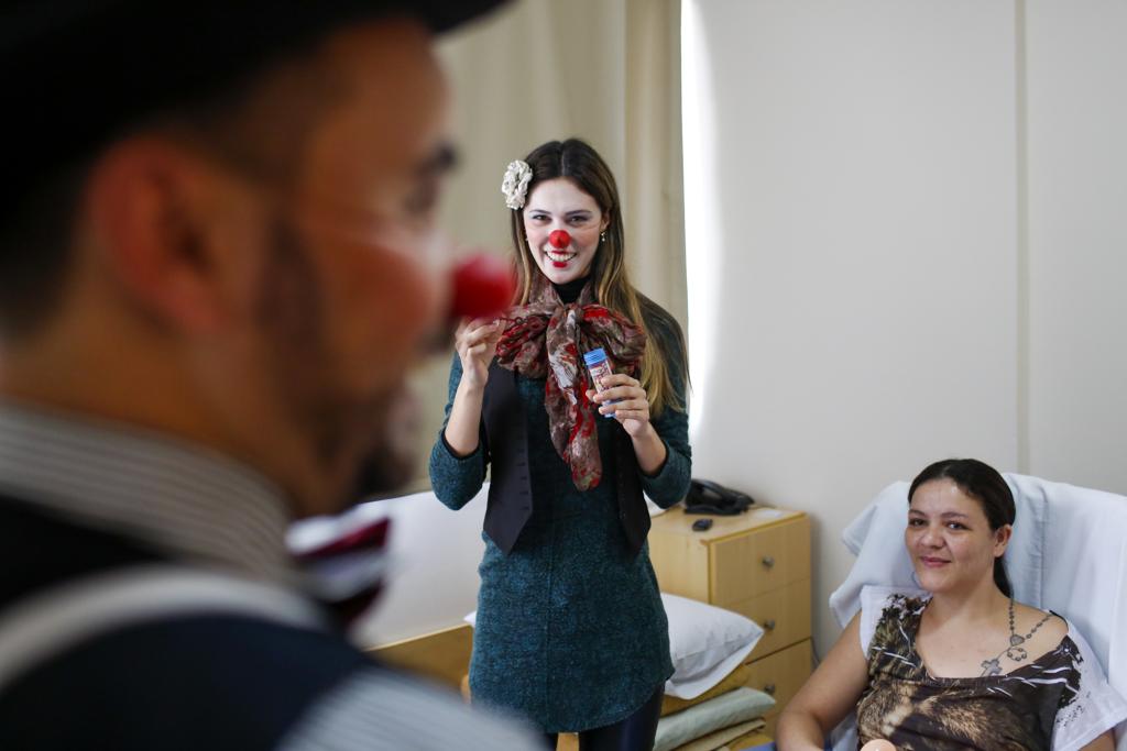 A cozinheira Tatiana Andrea, de 24 anos, está internada há 40 dias no hospital e recebeu a visita dos clowns em seu quarto. Ela perdeu o movimento das pernas depois de adquirir um vírus raro na medula. “A visita deles nos dá ânimo para continuar, quebra a rotina de hospital”, explica a paciente. Junto com ela, a mãe Soeli da Silva Andrea também se animou com as brincadeiras dos clowns do grupo.