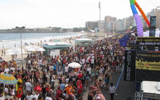 A 13ª Parada do Orgulho Gay tomou conta da praia de Copacabana, na Zona Sul do Rio, neste domingo (12). Cerca de 20 carros de som animam a festa, que tem previsão de terminar às 22h. Os organizadores esperam superar o público de 2007, estimado em 1,2 milhão de pessoas. O governador Sérgio Cabral e o ministro Carlos Minc, entre outros políticos e personalidades estiveram no evento.