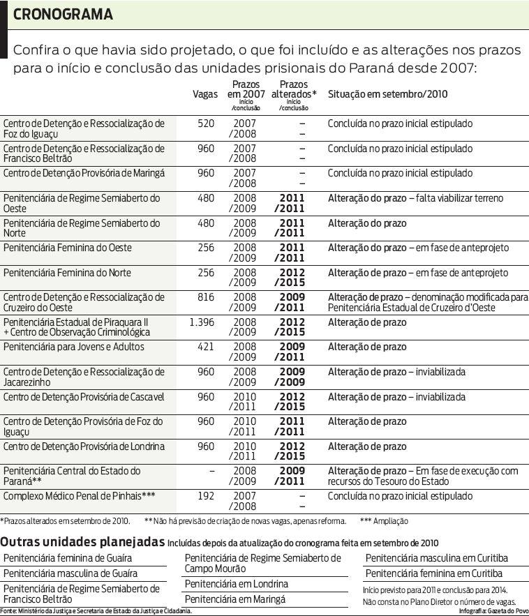 O Plano Diretor do Sistema Penitenciário do Paraná enumera a construção e reforma de pelo menos 20 unidades prisionais entre penitenciárias e centros de detenção provisória no estado (veja quadro ao lado). Com os atrasos que se arrastam há três anos, obras que deveriam ter sido iniciadas entre 2008 e 2010 tiveram os prazos prorrogados para os próximos anos. Por conta da atualização das metas, restabelecidas em setembro, o calendário atual sofreu alteração em todas as datas e ainda precisou incluir oito novas obras.