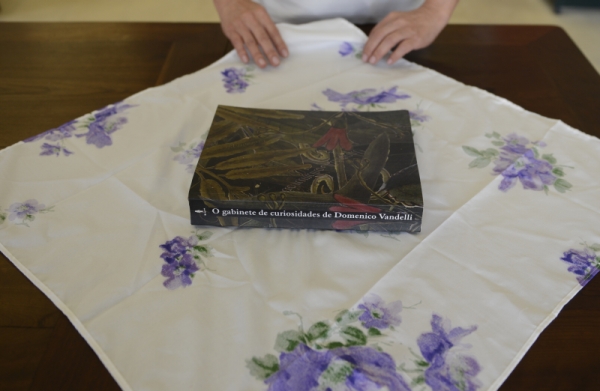 Tecido- Coloque o tecido com o lado avesso virado para cima na diagonal e coloque o livro no centro, com a lombada no lado oposto (Foto: Henry Milleo/ Gazeta do Povo)
