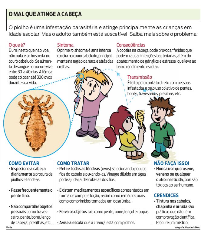 O que vive na cabeça da molecada, mas não é brincadeira? Piolho! E ele não escolhe idade, classe social ou cor de pele para atacar. Simplesmente aparece de um dia para o outro entre as madeixas infantis e causa o maior transtorno e preconceito. Muitos acreditam que a falta de higiene é o que atrai o parasita, mas a dermatologista do Hospital de Clínicas Kerstin Taniguchi Abagge explica que o inseto aparece pelo contato humano e pelo uso de objetos contaminados. Dos 400 atendimentos mensais no setor de dermatologia do hospital, 50 são de crianças com pediculose. Segundo dados da Agência Nacional de Vigilância Sanitária (Anvisa), até julho deste ano foram vendidos cerca de 2 milhões de frascos de medicamentos usados para o combate ao piolho. No ano passado, foram mais de 5 milhões.