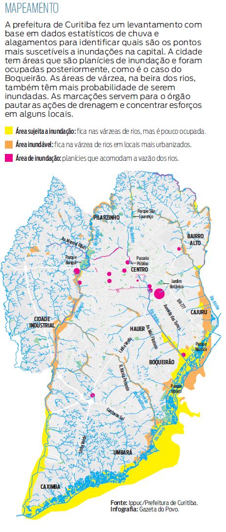 O estudo aponta que os pontos mais críticos da cidade no que diz respeito a alagamentos são as bacias dos rios Belém e Atuba. Franco lembra que áreas densamente povoadas da cidade como os bairros Hauer, Boqueirão e Cajuru estão localizadas em planícies de inundação. " É caro para tirar as pessoas de lá, sem falar no custo social, que é inaceitável. O prejuízo que se tem cada vez que se chove tem uma proporção de quase 5% do valor da área onde a inundação acontece", conta.