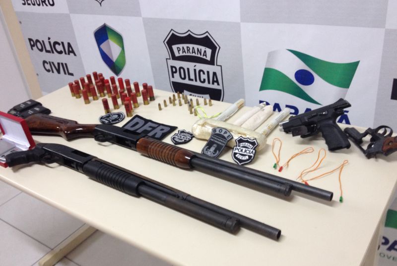 Quatro bananas de dinamite, duas espingardas, 150 pedras de crack e uma bicicleta de corrida estão entre os objetos apreendidos pela Delegacia de Furtos e Roubos (DFR) de Curitiba na manhã desta sexta-feira (17), no bairro Campina do Siqueira, em Curitiba. Três pessoas foram presas.