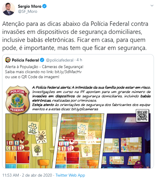 "Ficar em casa, para quem pode, é importante, mas tem que ficar em segurança", disse o ministro da Justiça e Segurança Pública Sérgio Moro nesta quinta-feira (2) ao compartilhar o alerta da PF no twitter.