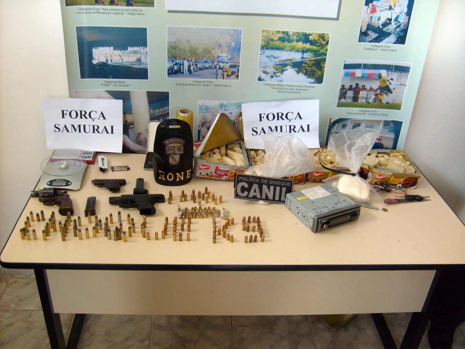 A polícia apreendeu sete quilos de crack e meio quilo de cocaína, somente no sábado (30). Na mesma ação, também foram encontradas duas pistolas, um revólver, três balanças de precisão e 150 cartuchos de munição para armas calibres 380, 9 milímetros e 38.