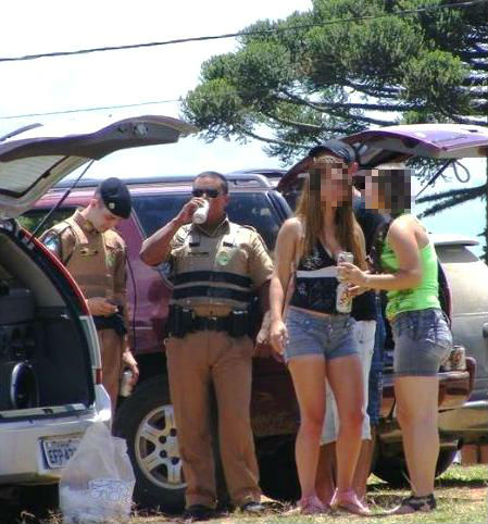 Uma imagem que circula na internet nesta segunda-feira (30) mostra dois policiais militares do Paraná que estariam ingerindo bebidas alcoólicas durante o horário de serviço. A foto gerou protestos de muitos internautas, que ficaram indignados com a situação. Os dois PMs aparecem com latas, que seriam de cerveja, ao lado de três jovens e de alguns carros estacionados.
