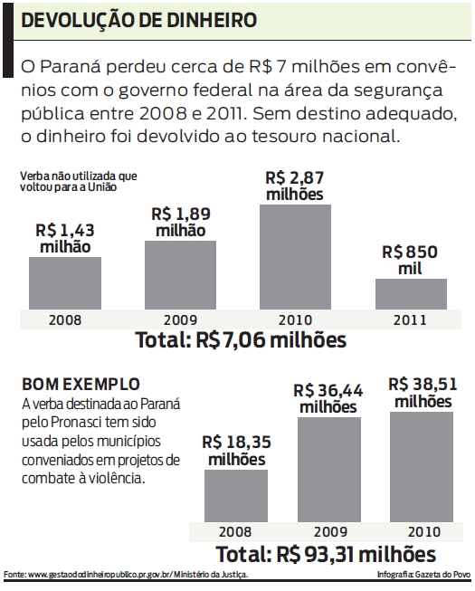 Dos R$ 7.062.584,15 perdidos pelo Paraná, R$ 6,2 milhões eram da Senasp e R$ 850 mil do Pronasci. Além de ter de devolver a quantia, o governo deve sofrer um corte no próximo repasse federal, uma espécie de punição pela não utilização dos recursos. "Quando você devolve, no ano seguinte se recebe menos", diz Souza.