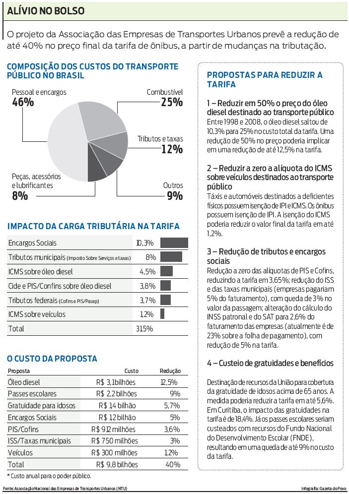 Um projeto desenvolvido pela Associação Nacional das Empresas de Transportes Urbanos (NTU) pretende diminuir em até 40% o valor das tarifas de transporte público no Brasil. Um conjunto de propostas apresentado na última quarta-feira na Câmara dos Deputados, em Brasília, prevê redução nos preços do óleo diesel e dos veículos e isenção do Imposto sobre Circulação de Mercadorias e Serviços (ICMS) para a aquisição de ônibus e diminuição de encargos sociais para as empresas do setor. Pelo levantamento, se a proposta fosse adotada na íntegra, a passagem de ônibus em Curitiba poderia cair dos atuais R$ 2,20 para aproximadamente R$ 1,35.