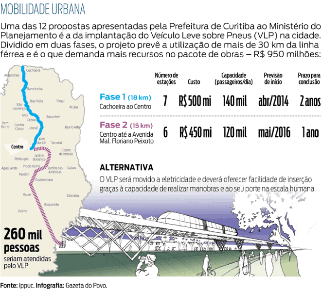 A proposta que demanda mais recursos do pacote com ações voltadas à mobilidade urbana apresentado nessa semana pela Prefeitura de Curitiba ao Ministério do Planejamento é a única que ainda não conta com a elaboração de um projeto executivo. Orçada em R$ 950 milhões, a implantação do Veículo Leve sobre Pneus (VLP) foi idealizada pelo arquiteto e urbanista e ex-governador do Paraná Jaime Lerner, e poderá ter uma extensão de mais de 30 quilômetros sobre o traçado ferroviário já disponível. O restante das intervenções pleiteadas já possui projeto básico, que, junto ao VLP, envolve R$ 5,3 bilhões.