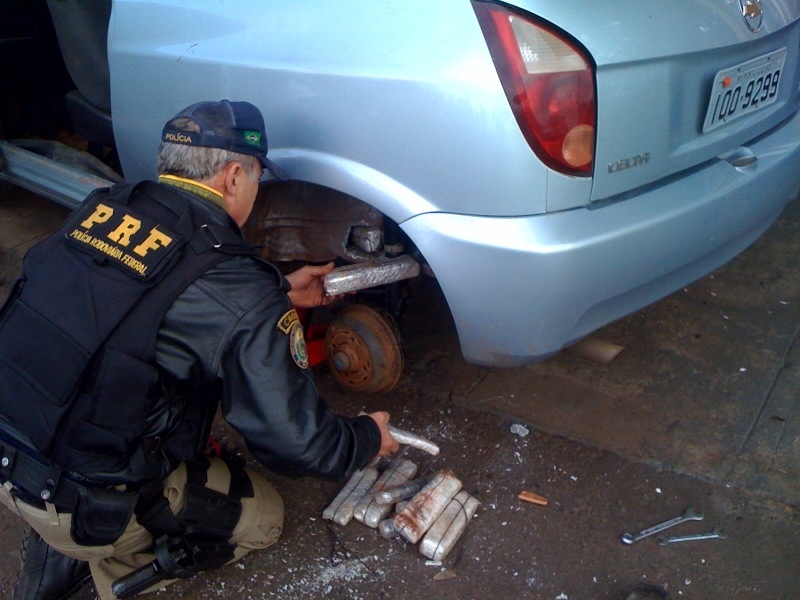 A Polícia Rodoviária Federal (PRF) apreendeu 3,6 quilos de haxixe escondidos na lataria de um carro nesta sexta-feira (13), em Laranjeiras do Sul, na região centro-sul do estado. A droga estava do lado de dentro do para-lama traseiro. Os policiais precisaram desmontar a roda e abrir a lataria para encontrar a droga. O carro, um Celta com placas de Porto Alegre, foi abordado durante uma fiscalização na BR-277.
