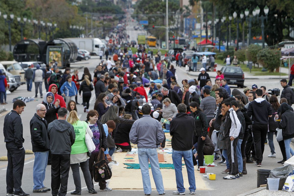 Cerca de 2 mil pessoas participam da montagem do tapete de flores. A tapeçaria confeccionada a partir de pó de café, flores materiais reciclados e serragem, começa no obelisco, ao lado da Catedral Basílica, e vai até o Paládio Iguaçu, no Centro Cívico.