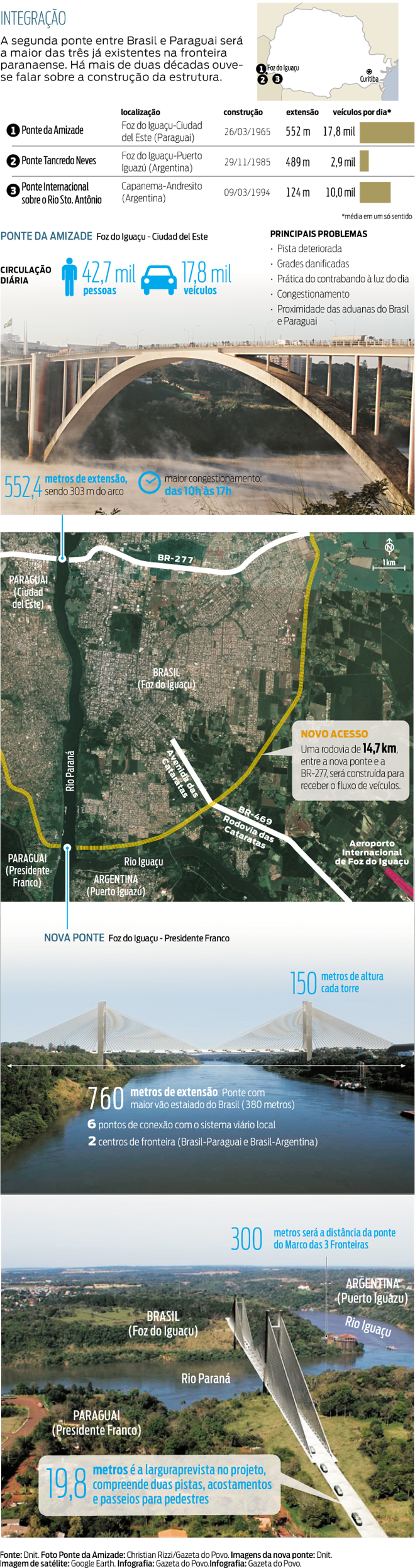 Maior obra rodoviária do governo federal no Paraná, com custo de R$ 233,4 milhões, a segunda ponte entre Brasil e Paraguai deve tirar da Ponte Internacional da Amizade, que liga Foz do Iguaçu a Ciudad del Este, o peso de ser um freio ao desenvolvimento. Palco de congestionamentos, falta de segurança, protestos e de contravenções, a ponte inaugurada há 49 anos está no limite. Hoje é rota diária para aproximadamente 17,8 mil veículos e 42,7 mil pessoas.