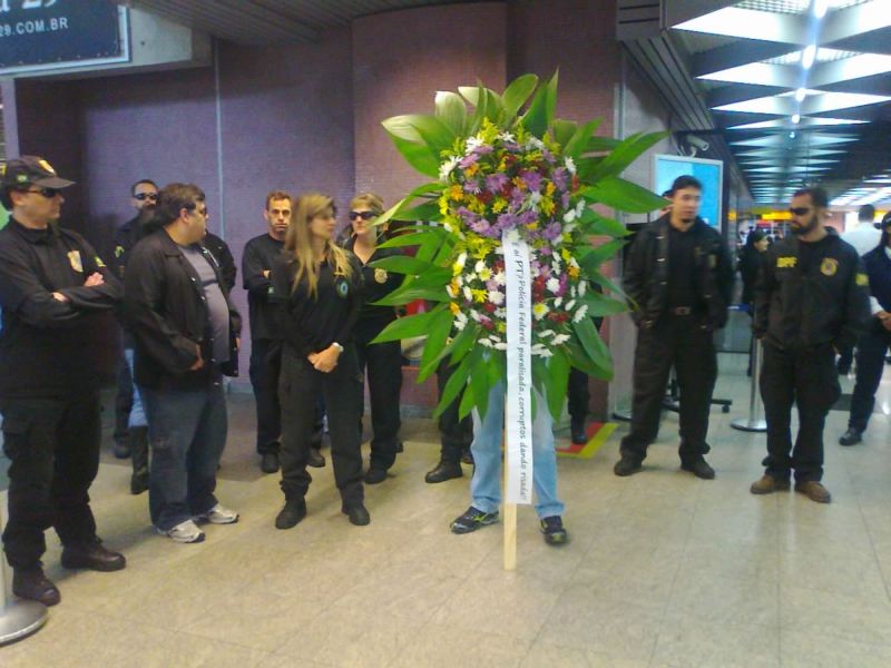 Policiais federais em greve fizeram um protesto no Aeroporto Afonso Pena, que serve a cidade de Curitiba, na manhã desta terça-feira (14). A categoria, que reivindica aumento salarial, reestruturação das carreiras e aumento no número de policiais, usou coroas de flores para um enterro simbólico do diretor da corporação, Leandro Daiello.