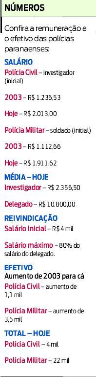 Parte dos policiais civis do Paraná promove campanha pela efetivação do plano de cargos e salários, regulamentação da aposentadoria especial e por melhores condições de trabalho. No fim de semana, a categoria fez passeatas em Londrina, Maringá, Ponta Grossa e Cascavel. Para o próximo dia 18, eles estão programando uma manifestação em Curitiba, no Centro Cívico, a partir das 13 horas.