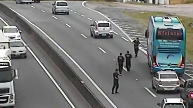 O grupo chegou a parar um ônibus de uma empresa de turismo do Rio Grande do Sul. Dois dos quatro homens invadiram o veículo, arrancaram a chave do motorista e seguiram pela marginal em direção ao bairro de Medeiros. Os outros dois homens escoltaram o ônibus com um Peugeot 307, na cor prata.