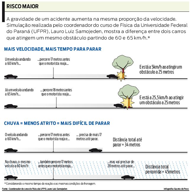 Altas velocidades em áreas urbanas são tão perigosas quanto dirigir com concentração de álcool acima da permitida. Esta é uma das conclusões de um estudo organizado pela Universidade de Adelaide, na Austrália. Na ocasião, os pesquisadores constataram que 68% dos acidentes em vias urbanas envolviam veículos com velocidade acima da estabelecida. Pior: conforme a análise, que também reconstituía as ocorrências, 46% desses acidentes teriam sido evitados se os condutores respeitassem a lei. "Em área urbana com velocidade limitada, o risco de se envolver em acidentes dobra a cada cinco quilômetros acima desse limite", afirma a análise.O exagero no acelerador, portanto, independe de país. A gravidade das ocorrências, no entanto, depende e se multiplica em função de diferenças mínimas de velocidade e condições da pista (veja infográfico ao lado). Uma simulação realizada pelo coordenador do curso de Física da Universidade Federal do Paraná (UFPR), Lauro Luiz Samojeden, mostra que um carro a 60 quilômetros por hora acerta um obstáculo postado a 25 metros com velocidade de 5 quilômetros por hora. Nas mesmas condições, um veículo igual a 65 quilômetros por hora acertaria a barreira a 25,5 quilômetros por hora. A diferença de cinco quilômetros se transforma em 20 no momento do acidente. "Quanto maior for a velocidade inicial, maior será a distância que o carro vai percorrer para parar", ressalta Samojeden.Análise do Instituto de Pesquisa Econômica Aplicada (Ipea), realizada no ano passado, baseada no banco de dados de 2004 da Polícia Rodoviária Federal (PRF), mostra que o excesso de velocidade é o fator responsável pela maior parte das ocorrências. Outras três causas, contudo, colaboram nos acidentes: falta de educação no trânsito, má condição e erros de engenharia de ruas e rodovias e o desenvolvimento urbano descontrolado em torno das estradas. A última causa, aliás, obrigou a rodovia que liga São Paulo ao ABC a baixar o limite de velocidade de 110 quilômetros por hora para 90 quilômetros por hora. E muitas vidas foram salvas pela iniciativa.Coordenadora de Educação para o Trânsito do Departamento Estadual de Trânsito (Detran-PR), Maria Helena Gusso Mattos considera que o motorista brasileiro, de maneira geral, excede a velocidade por confiar em sua habilidade. "Há pessoas que acham que dirigem muito bem e, por isso, nunca vão se meter em acidente", afirma Maria Helena. Só que o limite de 60 quilômetros na maior parte das vias urbanas não foi definido por acaso. "Isso é feito a partir de estudos e cálculos. O engenheiro de tráfego avalia todas as condições, como o tempo de reação, de frenagem e a distância para parar o carro", explica a coordenadora."O motorista tem um comportamento padrão. Quando avista alguém cruzando a rua a 50 metros, tende a acelerar e ainda a buzinar para que o pedestre corra", diz o psicólogo e consultor em projetos e ações sociais da Associação Brasileira de Educação para o Trânsito (Abetrans), Marccelo Pereyra. "Não se pensa defensivamente. No entendimento geral, é o pedestre que deve correr porque está atrapalhando o trânsito", acrescenta o também autor do livro O Motorista Brasileiro. Esse comportamento padrão, ilustrado em muitos desenhos animados, é realidade: o pacato cidadão, ao entrar em seu carro, se transforma em um ser agressivo e disposto a qualquer coisa para rodar com trânsito livre.