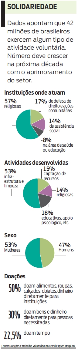 A designer Taís da Silva Ribeiro, 24, pratica o voluntariado desde a adolescência. Ela fazia ações esporádicas no bairro onde morava e na escola, mas foi na faculdade que conseguiu estruturar suas boas ações. Os estudos e o trabalho limitavam o tempo que podia dedicar ao próximo, mas a jovem descobriu na internet uma aliada. Taís passou a acionar sua rede de e-mails cada vez que se deparava com alguma instituição pedindo ajuda. A participação no movimento estudantil ampliou o número de contatos e durante quatro anos os amigos e conhecidos de Taís ajudaram a organização não governamental Aliança Empreendedora a realizar projetos. "O voluntariado a pessoa faz porque quer e ponto. É uma motivação diferente daquela estabelecida em uma relação de trabalho, que envolve benefícios financeiros."