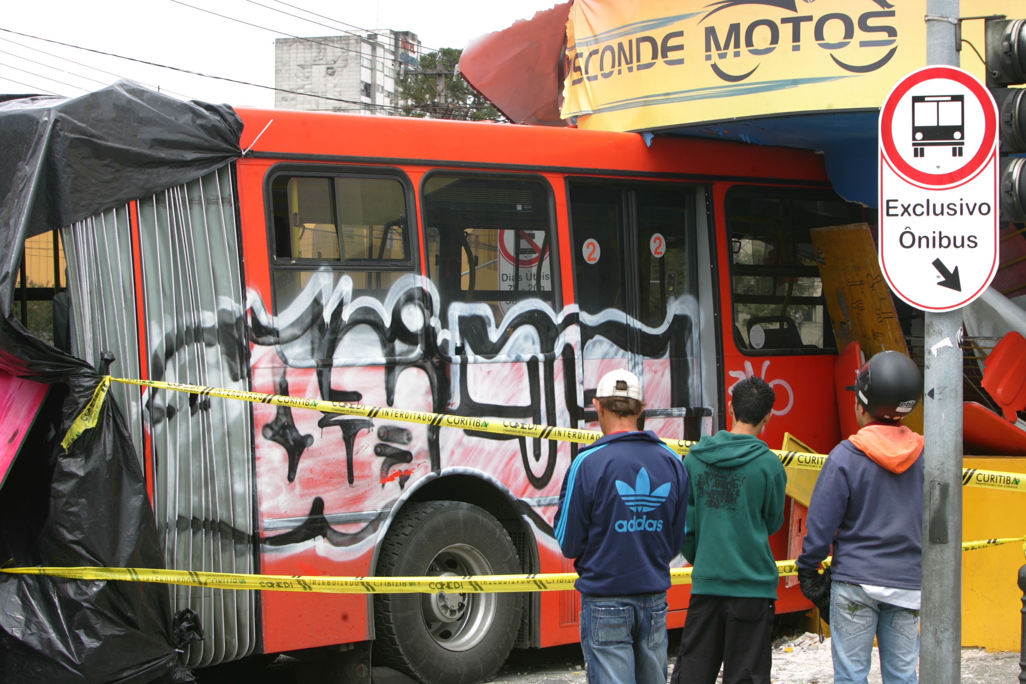 A parte da frente do biarticulado que invadiu uma loja de motos no Centro de Curitiba na madrugada de segunda-feira (24) continua no local, bloqueando uma das três faixas da pista da direita da Avenida Visconde de Guarapuava, nesta quarta-feira (26). Enquanto um impasse técnico atrasa o trabalho de retirada do veículo, a cena continua chamando a atenção das pessoas que passam pela avenida.