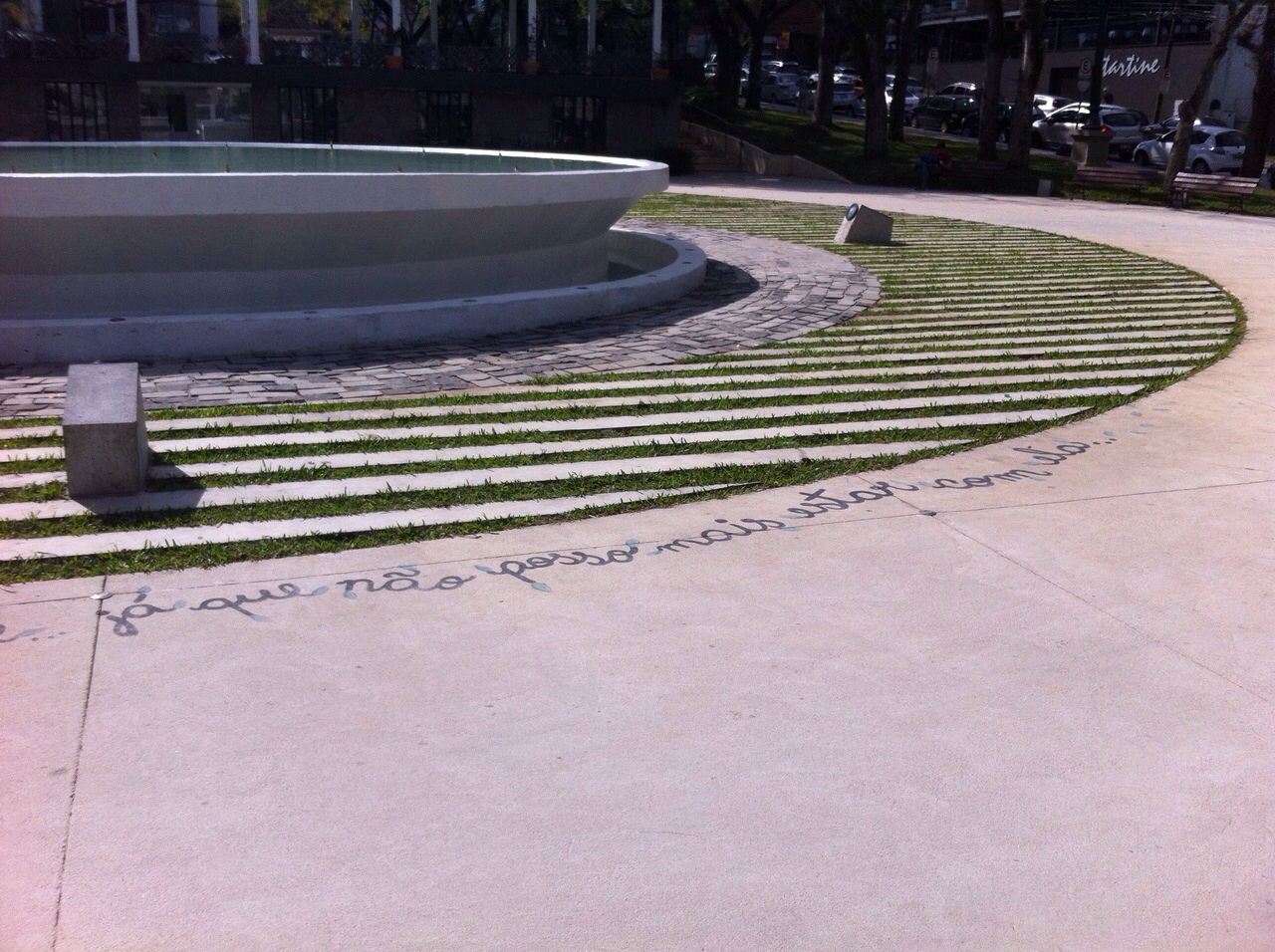 Também na noite desta quinta-feira, uma frase foi pintada no piso próximo ao chafariz da Praça da Espanha, no bairro Bigorrilho. “Embora provavelmente tenha sido feita por um ativista, porque na frase é cobrada mais grama no local, também se trata de um ato que se enquadra nas penalidades de pichação, de vandalismo. Dentro de uma sociedade democrática, a pessoa poderia ligar para o 156 da prefeitura de Curitiba e registrar a insatisfação”, explica o diretor da GM.
