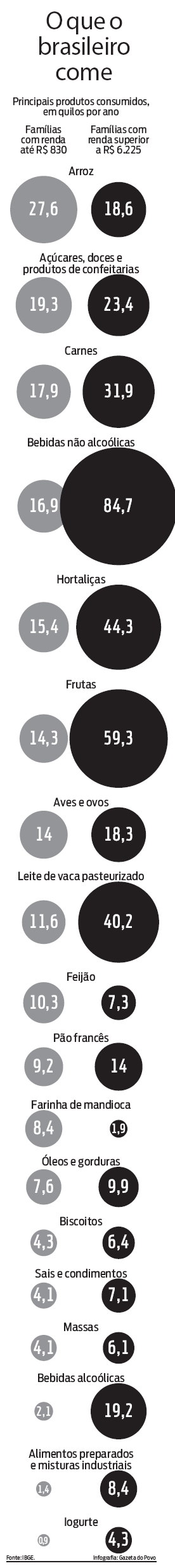 No carrinho do supermercado, o que ocupa maior espaço hoje são bebidas e infusões (a média domiciliar per capita é de 50,7 quilos), seguidas por laticínios (43,7 quilos). Só então entram cereais e leguminosas (39 quilos), frutas (28,9 quilos), hortaliças (27,1 quilos) e carnes (25,4 quilos). "Sem dúvida, a gente percebe uma mudança no cardápio do brasileiro", afirma o gerente da Pesquisa de Orçamentos Familiares 2008/2009, Edilson Nascimento Silva.