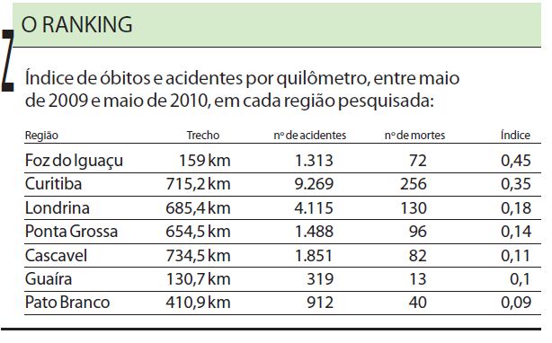 Para o inspetor da PRF Fabiano Moreno, o grande número de veículos e a mistura do trânsito rodoviário com o trânsito urbano ajudam a colocar Foz no topo da lista. "O trecho tem várias cidades pequenas e um grande número de veículos. Em Foz se evidencia a mistura do trânsito rodoviário, de longa distância, com o trânsito local", afirma. "Foz também é rota para o Paraguai. Temos o trânsito de ônibus e caminhões que atravessam o país vizinho e também a Argentina." Na RMC, que concentra o maior número de veículos entre as BRs no estado, há 0,35 morte por quilômetro. Na região de Londrina, o índice é de 0,18. A média estadual é de 0,19.
