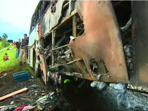 Sacoleiros atearam fogo em um ônibus de turismo em Santa Terezinha do Itaipu, no Oeste do estado, neste domingo (23). Quase toda a mercadoria contrabandeada do Paraguai como cigarros, isqueiros, bebidas e produtos eletrônicos foi destruída pelo fogo.