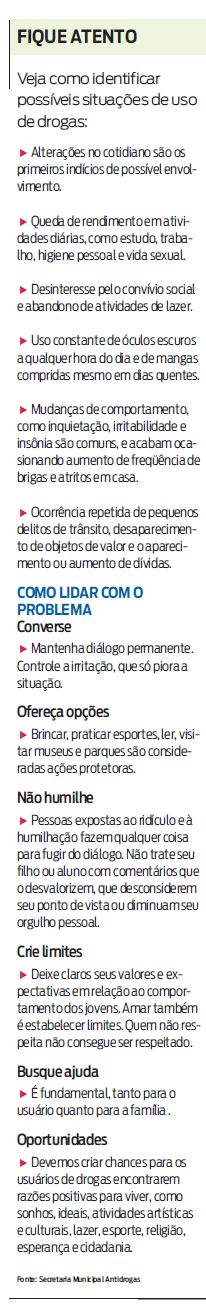 O Dia Mundial de Luta contra as Drogas foi criado em 1987 pelas Nações Unidas. Criada em abril de 2008, a Secretaria Municipal Antidrogas padronizou um conjunto de informações para ajudar a inibir o consumo e o tráfico de drogas. As dicas são apresentadas em palestras para pais, professores e líderes comunitários de Curitiba e de outras cidades do Paraná. "É preciso estar atento", diz o titular da secretaria, Fernando Francischini. "Problemas familiares, dores, tensões, angústias e depressões podem levar à busca de soluções irreais por meio das drogas. A maioria dos jovens se envolve com essas substâncias por falta de informação."