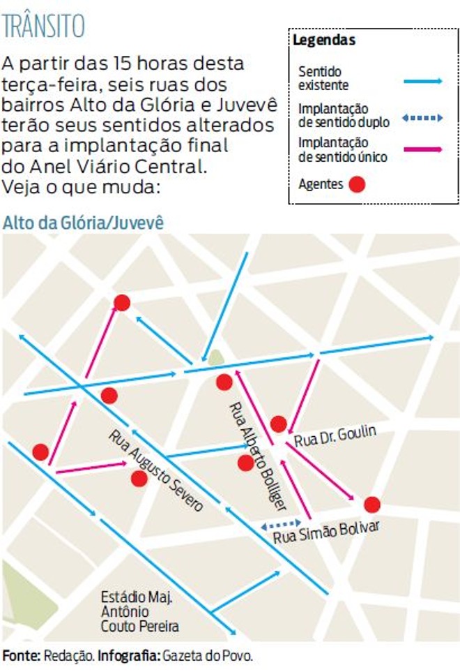 Desde as 15 horas desta terça-feira (6), seis ruas do bairro Alto da Glória estão com os sentidos alterados, segundo informou a Secretaria de Trânsito de Curitiba (Setran). A mudança, que atinge as ruas Alberto Bolliger, Barão dos Campos Gerais, Simão Bolívar, Doutor Goulin, Cândido Mader e Doutor Zamenhof, foi necessária para viabilizar a implantação final do Anel Viário Central.
