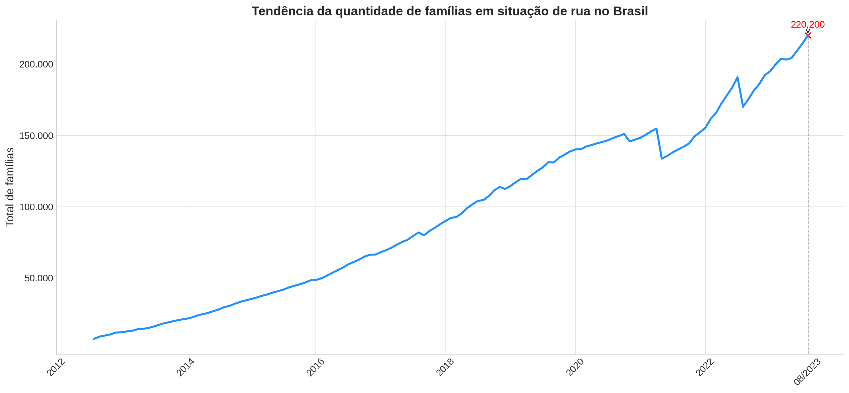 Em agosto, último mês analisado até o momento, a população de rua era 2,72% maior que em julho – o Brasil tinha 220,2 mil famílias nas ruas registradas pelo governo; no mês anterior, o número havia sido de 214,4 mil.