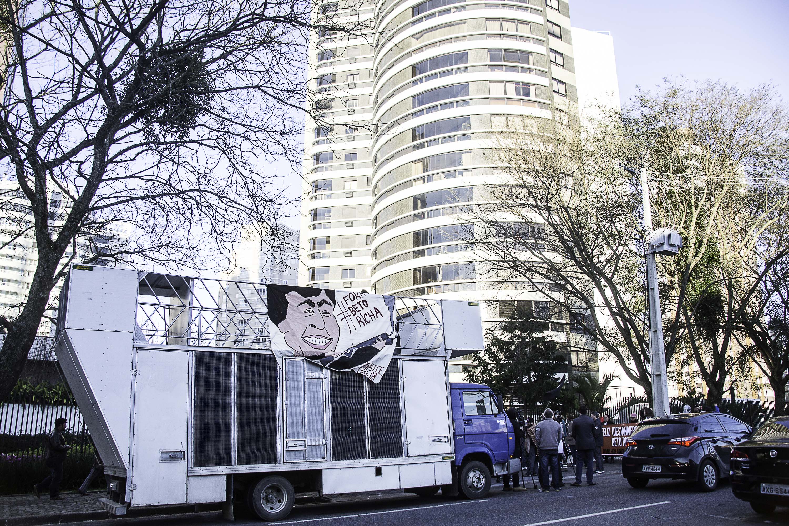 Cerca de 100 professores e servidores públicos de outras categorias fizeram um ato de protesto em Curitiba, em frente à casa do governador do Paraná, Beto Richa (PSDB), na manhã desta quarta-feira (29). Observados por policiais militares, que acompanharam toda a manifestação, os servidores prepararam um café da manhã na calçada em frente ao prédio do tucano, na Rua Professor Pedro Viriato Parigot de Souza, no bairro Mossunguê, e também “comemoraram” o aniversário de 50 anos do governador, completados hoje, com um bolo e até uma “telemensagem”.
