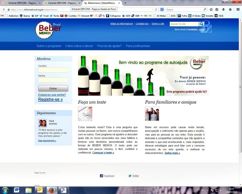 Uma nova ferramenta gratuita e interativa pode ajudar dependentes de álcool e familiares em todo o Brasil. O programa Beber Menos do site Informálcool (www.informalcool.org.br/bebermenos) concluiu após um ano a fase de testes e está disponível ao público. Os usuários podem se cadastrar de forma anônima e, a partir de informações individualizadas, recebem autoavaliações que podem levá-los a reduzir o consumo de bebidas e até parar de beber.