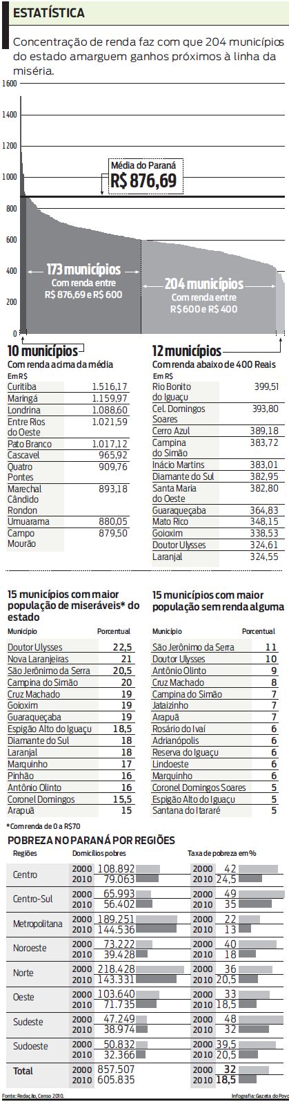 Apenas em dez municípios paranaenses os moradores têm renda superior à média do estado. O levantamento da Gazeta do Povo, baseado no Censo 2010, mostra que, embora a renda média no Paraná seja de R$ 876, a desigualdade persiste. "Não dá para considerar que o Paraná é igualitário e que todas as regiões são semelhantes", diz a assistente social e professora da Pontifícia Universidade Católica do Paraná (PUCPR) Jucimeri Isolda Silveira.