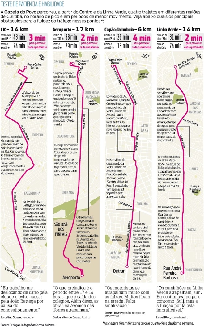 Mesmo trechos relativamente pequenos, como o percurso de seis quilômetros da Gazeta do Povo até a sede do Detran, no bairro Capão da Imbuia, pode levar quase meia hora em um horário de pico o dobro do tempo gasto em um período menos turbulento do dia.