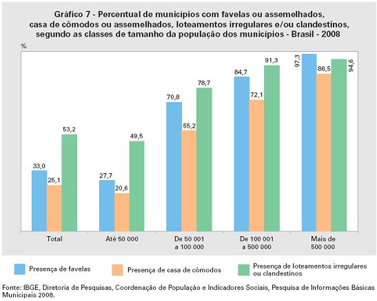 A Munic confirma, segundo o IBGE, que a incidência de favelas é maior nos municípios em que a população é maior. O porcentual de municípios que relataram existência de favelas salta de 27,7%, naqueles com até 50 mil habitantes, para 70,8% dos que têm entre 50 mil e 100 mil habitantes, chegando a 84,7% dos municípios com entre 100 e 500 mil habitantes. Dos 37 municípios com população acima de 500 mil habitantes, só Cuiabá informou a inexistência de favelas. Os loteamentos irregulares ou clandestinos estão presentes em mais da metade dos municípios (53,2%).