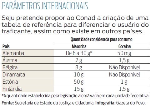 Em vários países já existe uma tabela que orienta a Justiça sobre o quanto de droga pode ser considerado como de uso pessoal diário. Na Dinamarca, a referência é de 10 gramas de maconha. Segundo a secretária, foi criado no Paraná um núcleo de pesquisa para estudar quem são as pessoas que estão encarceradas. Os dados específicos de Curitiba e do restante do estado devem ser divulgados no fim de novembro. O mesmo estudo deverá ser feito em todo o país, pelos outros secretários, para embasar as análises no Conad.