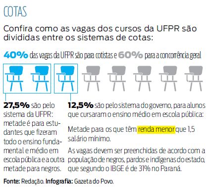 Já o sistema estabelecido pela Lei de Cotas destina 12,5% das vagas a alunos que cursaram todo o ensino médio na rede pública. Metade dessas vagas é direcionada a candidatos com renda familiar inferior a 1,5 salário mínimo por pessoa. Além disso, a distribuição pelo sistema federal deve respeitar o porcentual de negros, pardos e indígenas estabelecido pelo IBGE. No Paraná, essa taxa é de 31%.