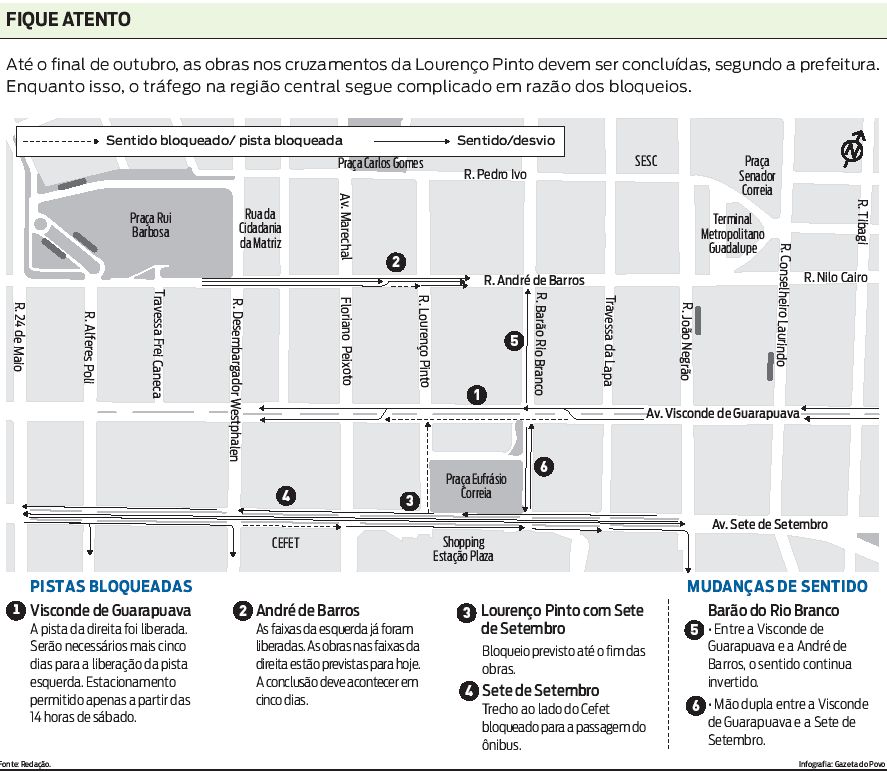 Paciência continua sendo o lema dos motoristas que precisam trafegar pela área central de Curitiba nos horários de pico. Ao mesmo tempo, obras continuam sendo executadas nos cruzamentos da Rua Lourenço Pinto com a Avenida Visconde de Guarapuava e com a Rua André de Barros, além da interdição para veículos da Avenida Sete de Setembro (veja infográfico). As dificuldades dos motoristas devem permanecer até o fim do mês, prazo estipulado pela prefeitura de Curitiba para o término das intervenções.