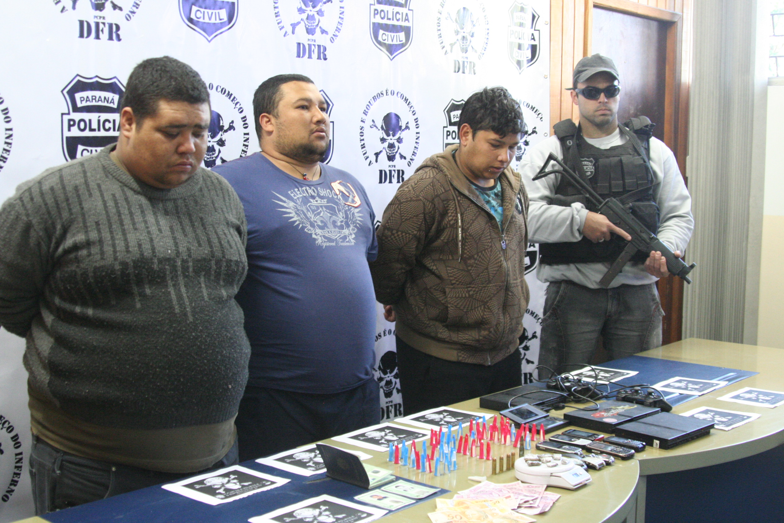 A Delegacia de Furtos e Roubos (DFR) apresentou, nesta quinta-feira (6), três homens, que foram presos sob acusação de tráfico de drogas e receptação de produtos roubados. De acordo com a polícia, os acusados são irmãos e comercializavam cocaína e maconha no Bairro Alto, em Curitiba. Equipamentos eletrônicos e outros objetos foram apreendidos com o grupo.