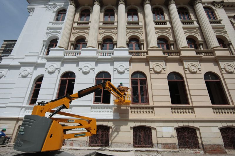 A restauração inclui o conserto de rachaduras, de partes soltas do revestimento e das esquadrias. A anterior cor bege está dando lugar ao branco, matiz original do edifício. "A pintura de fundo já foi iniciada e agora estamos fazendo testes com vários tons de branco para definir a cor definitiva", explica.