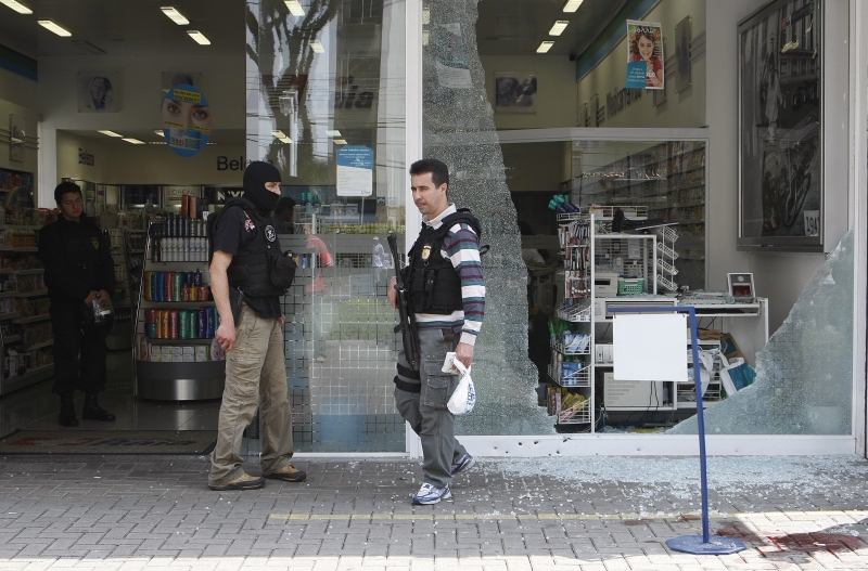 Os policiais tentaram abordar os assaltantes quando eles deixavam o estabelecimento, mas um dos bandidos teria iniciado um tiroteio. De acordo com policiais civis, o tiroteio durou cerca de 5 minutos e dezenas de disparos foram efetuados. Os tiros atingiram também os vidros da farmácia, que ficam ao lado do caixa do estabelecimento. Os clientes da drogaria e do posto de gasolina que ficam no centro comercial não se feriram.