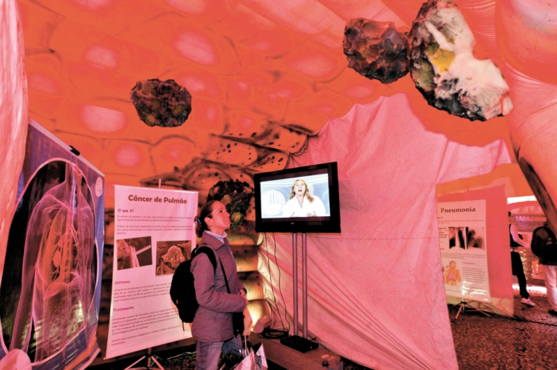 Uma estrutura inflável na Praça Rui Barbosa, no Centro de Curitiba, leva pessoas a uma incursão pelos pulmões. O espaço aberto gratuitamente ao público até o próximo sábado alerta o visitante sobre as principais doenças respiratórias. Fumantes com mais de 40 anos também podem fazer um exame de espirometria para conhecer sua capacidade pulmonar e se precaver de doenças do sistema respiratório. Vídeos e cartazes esclarecem sobre sintomas e tratamentos de enfermidades como asma, fibrose pulmonar, pneumonia, câncer de pulmão e tuberculose. O "pulmão gigante" tem 190 metros quadrados e é uma iniciativa da Sociedade Brasileira de Pneumologia e Tisiologia.