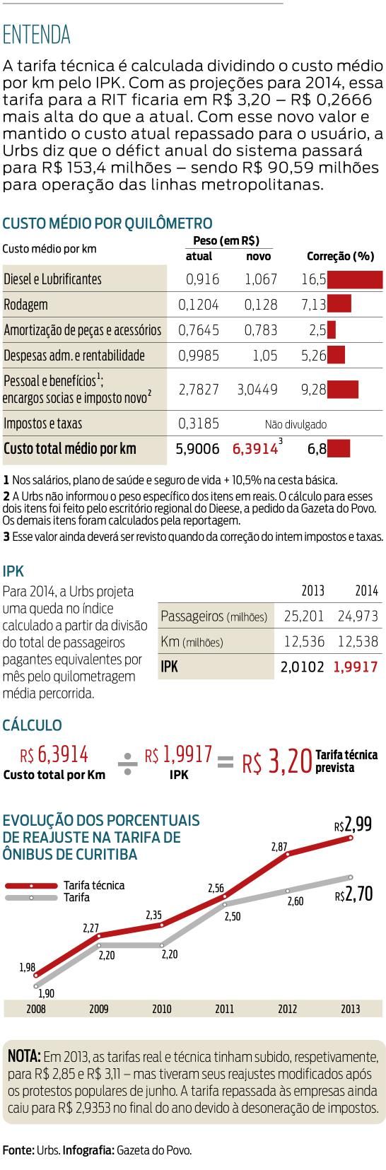 A tarifa técnica é resultado de uma conta complexa, que envolve itens como o custo do diesel, lubrificantes, peças, despesas administrativas e a taxa de rentabilidade repassada às empresas. Aplicando as projeções da Urbs aos valores que compõem a tarifa técnica atual, a nova tarifa ficaria em R$ 3,20. Mas ainda não entrou nesse cálculo a correção do item referente aos impostos e taxas.