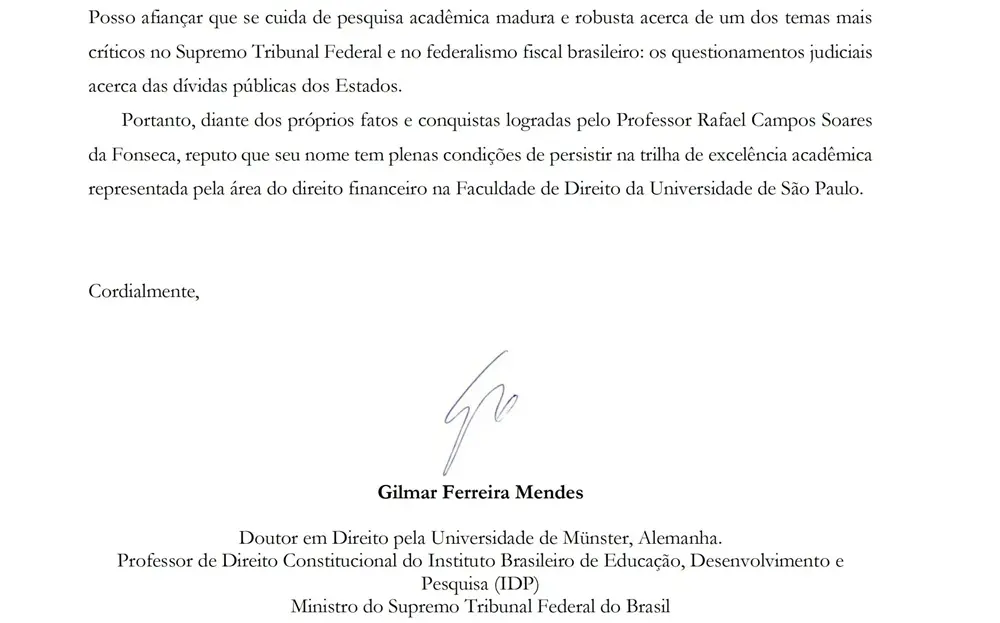 O caso tem gerado controvérsia na comunidade acadêmica há mais de um ano. Fonseca anexou ao seu memorial — documento que serve de base para a avaliação curricular dos concorrentes — diversas cartas de recomendação de autoridades do alto escalão do Judiciário brasileiro.